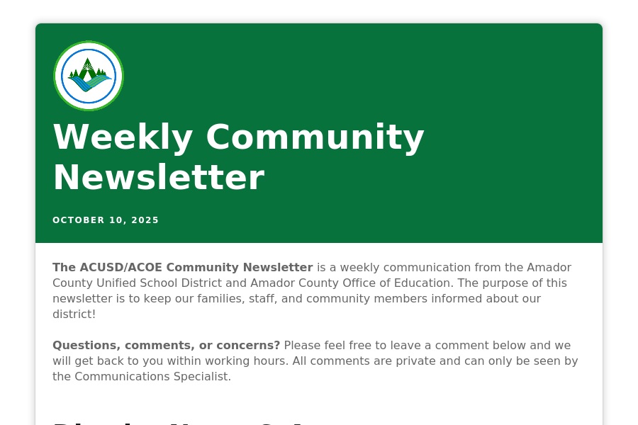 Weekly Community Newsletter October 10, 2025 The ACUSD/ACOE Community Newsletter is a weekly communication from the Amador County Unified School District and Amador County Office . . .